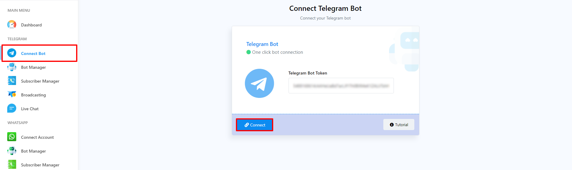 Go to Connect Bot menu. Now you have to enter the bot token you recieved from botfather into the field called Telegram bot token. After entering the Telegram bot token, click on the Connect bot button.