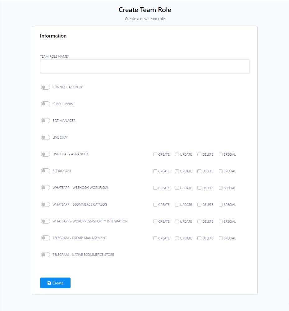 - Click the `Create` button to add a new team. Provide name of the Team and toggle various option you like.